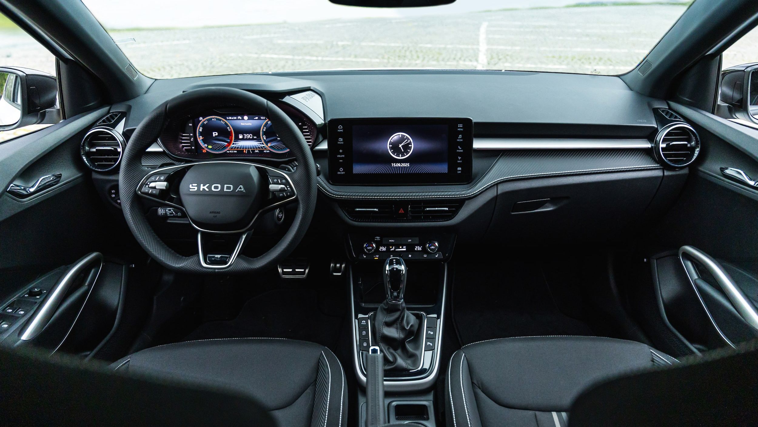 Unutrašnjost modela Fabia 130 dizajnirana je za maksimalnu udobnost i kontrolu u svakoj situaciji. Električna sportska sjedala s bočnim potporama pružaju optimalnu potporu tijekom dinamičnog skretanja. Trokrako višenamjensko sportsko kolo upravljača i papučice od nehrđajućeg čelika dodatno doprinose ambijentu usmjerenom na performanse. Posebni crni aluminijski pragovi vrata i srebrni ukrasni elementi na instrumentnoj ploči i ručkama vrata dodaju sportski dodir. Virtualni cockpit od 10" dio je serijske opreme, a opcijski 9" infotainment zaslon omogućuje naprednu povezivost.